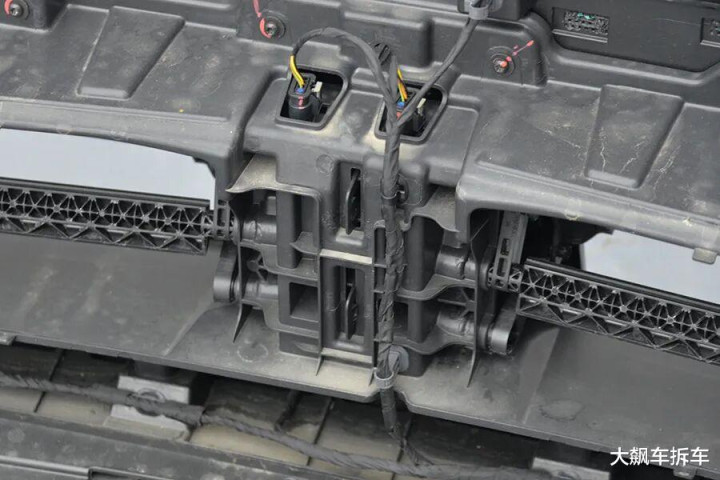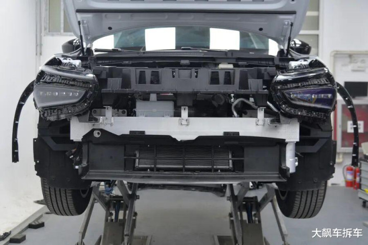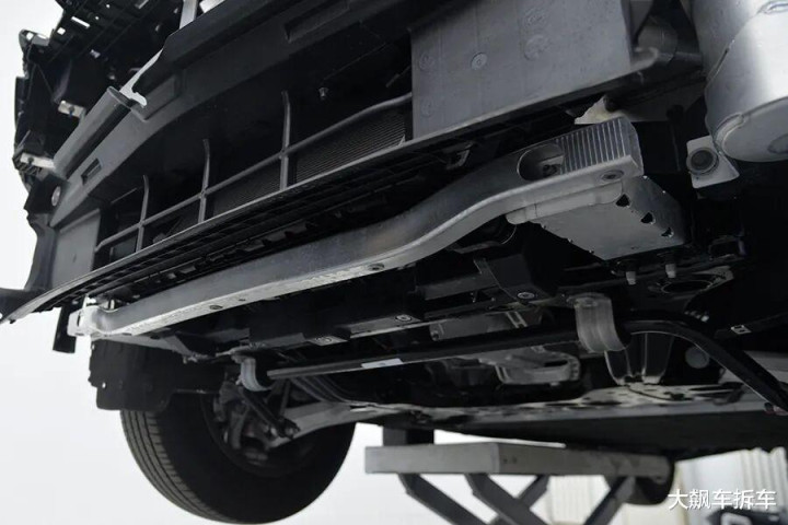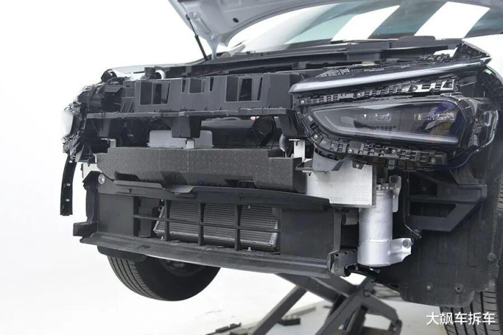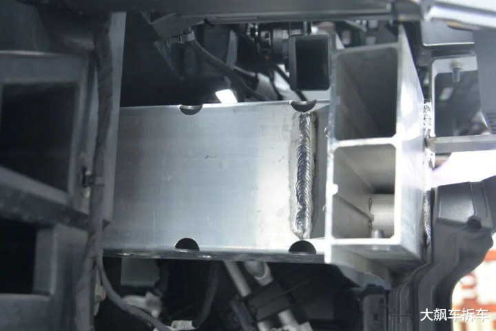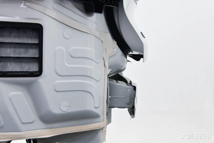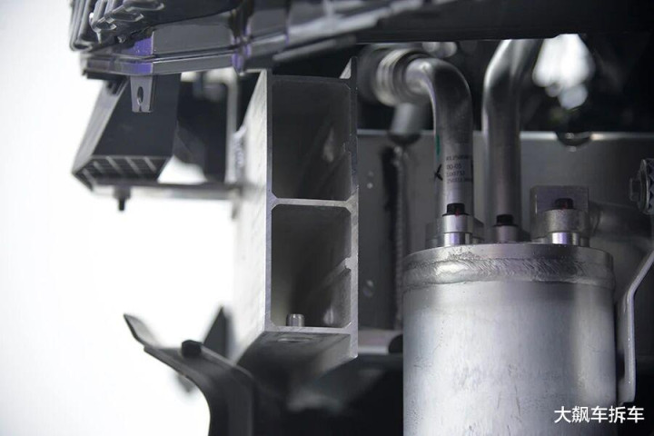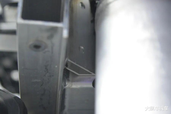 拆掉前保险杠,看到内部有一根铝合金前防撞梁,厚度为3.16毫米,能覆盖车头的69.95%,基本和小鹏G6一模一样。