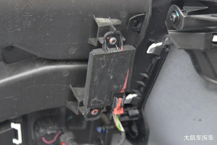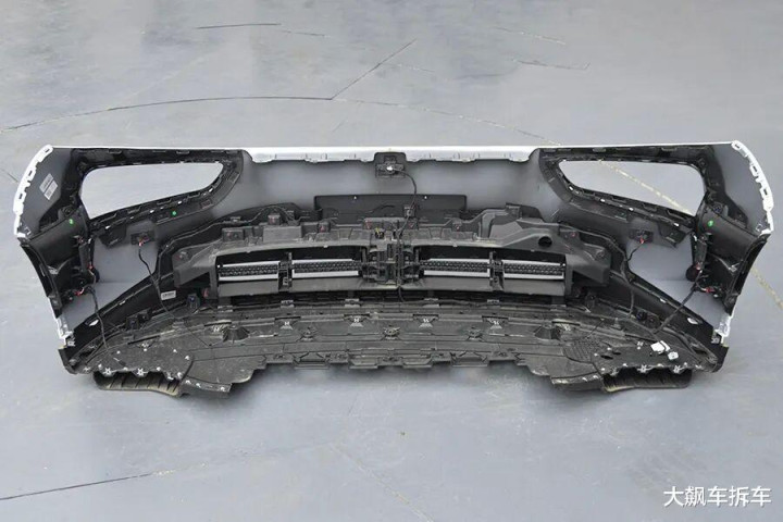 前保险杠下方有主动式进气格栅,格栅电机的位置隐藏着一个毫米波雷达,两侧有两个蓝牙模块,并且是UWB超宽带模块。