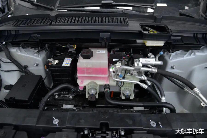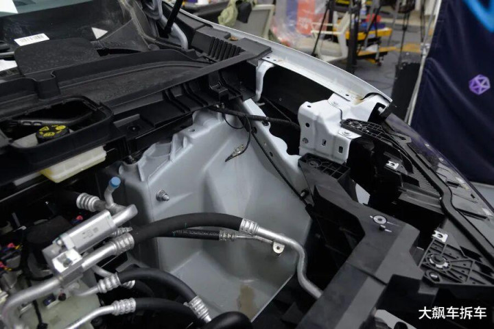拆掉前机舱护板,能看到内部的集成度还不错,使用了集成式阀体结构,辅助全车热管理合理分配。