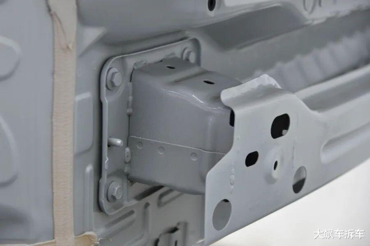 这辆车的后防撞梁并没有使用铝合金材质,而是一根单层冲压钢板防撞梁,厚度为1.03毫米,能覆盖车尾65.76%的范围,和小鹏G6一模一样。