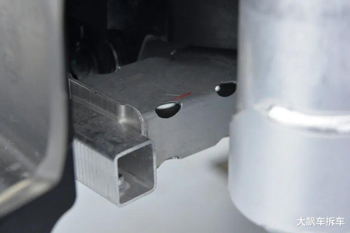 这辆小鹏G7的前后防撞梁与G6差不多,铝合金前防撞梁,单层钢板后防撞梁,基本上是这个价位新能源车的标配。但是它的前后一体压铸工艺并不多见,我们之前拆过的近400款车只有为数不多的几个用了前后大压铸。这种铝合金大压铸的车身框架能够提高生产效率,降低制造成本,让车价更低,也就更有市场竞争力。